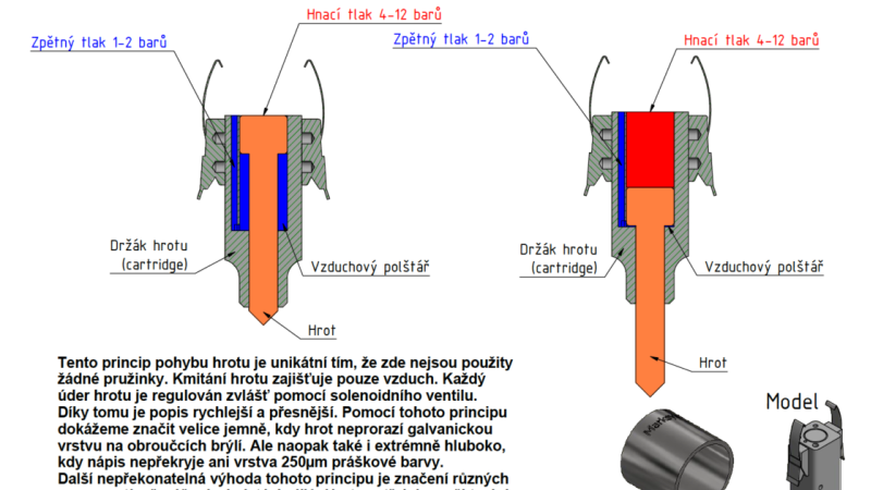 Jako jediná firma nabízíme pneumatické mikroúdery na principu pohybu hrotu VZDUCH/VZDUCH (bez použití vratné pružiny). Tento způsob mikroúderového značení umožňuje ideálně značit velmi jemné díly.