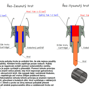 Hroty u našich mikroúderů nekmitají, ale každý úder je řízen jednotlivě. Hrot je díky tlaku vzduchu neustále vystřeďován, není rozkmitán pružinkou.